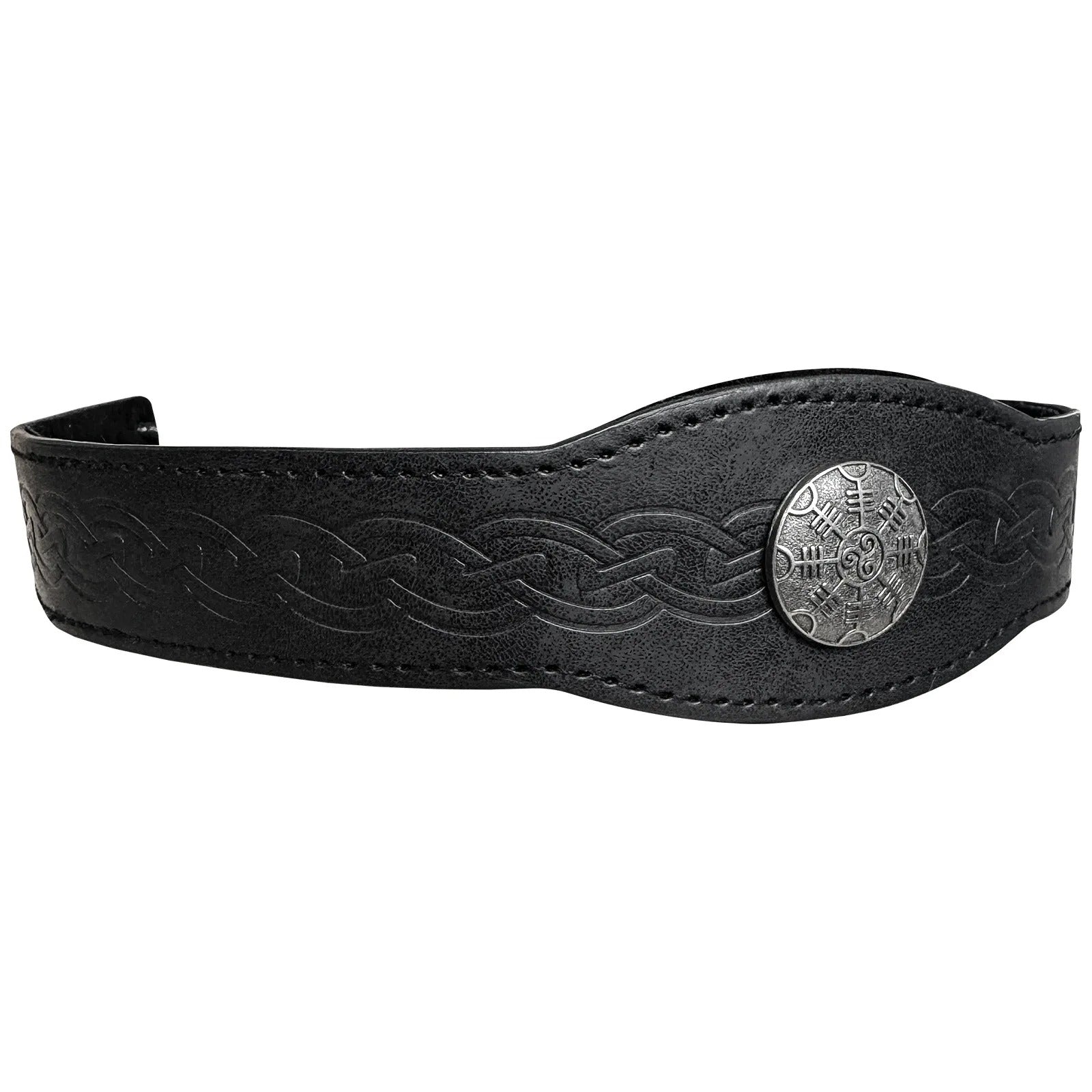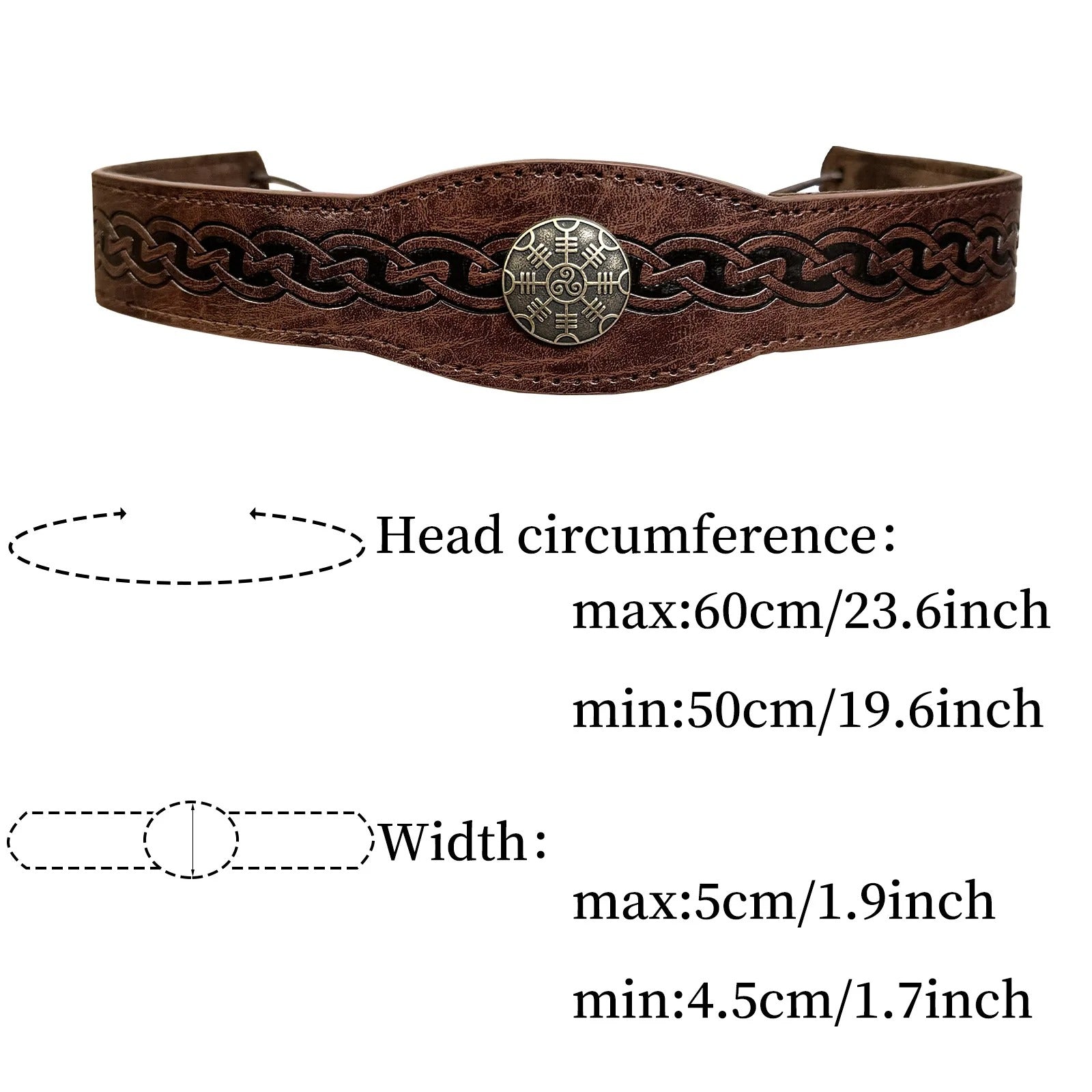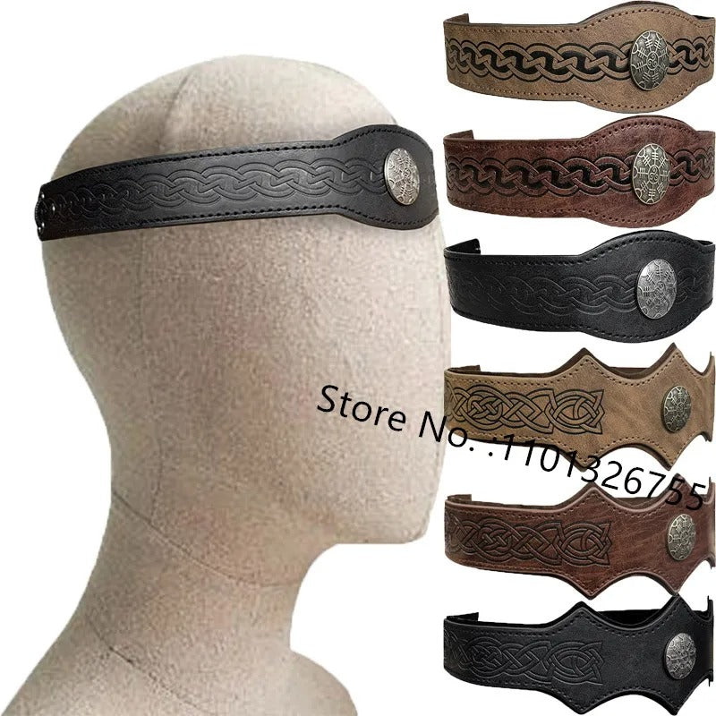 Das verstellbare Stirnband besteht aus Kunstleder und besitzt ein zentrales Ægishjálmr-Medaillon sowie geprägte Wikinger-Knotenmuster entlang der gesamten Länge. Mit einem Kopfumfang von 50–60 cm ist es für die meisten Erwachsenen geeignet und bequem zu tragen – perfekt für Reenactments, LARP, Cosplay oder Bühnenauftritte.